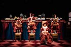 Im Stück sind es vier Fanfaren eines namenlosen Königs. Sie warten. Kommt er oder oder kommt er nicht? Die üppige Frühstückstafel ist angerichtet, erreichbar nur über überdimensionierte Stühle auf einem noch höheren Tisch. Alle Lieblingsspeisen des Königs stehen dort im Überfluss, wie im Märchen oder bei Disney. Das Unerwartete und Undenkbare tritt tatsächlich ein. Er kommt dieses Mal nicht. Man verspürt Unsicherheit. Sollen sie das starre Korsett abwerfen oder auf das vielleicht noch zu Erwartende warten?