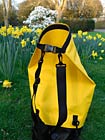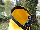 Das erste Produkt ist der Rucksack „Safepack 20l“ in gelb. Es gibt ihn auch in schwarz. Für den Outdoor-Bereich ist gelb aber die optisch schönere und frischere Wahl, egal für welche Jahreszeit. Es passt jede Menge hinein, 20l. Das Material ist absolut wasserabweisend. Die 0,5 mm dicke PVC Plane ist sehr robust. Es fühlt sich gut an, nicht zu steif und auch nicht labberig. Der Bodenbereich ist schwarz, ergänzt durch einen silbrigen Reflektor für die Sicherheit. Das Gewicht von ca. 500 g und die Maße von 240 x 240 x 600 mm passen auf jeden erwachsenen Rücken. Die Trageriemen kann man abnehmen. Der gesamte Rucksack lässt sich problemlos reinigen. Besonders pfiffig ist die Verschlusstechnik am oberen Ende. Es gibt dort keinen Reißverschluss! Man hat dort zwei parallele Metall-Bänder eingenäht, die von einem Klick-Verschluss im Halbbogen nach hinten so eng gespannt werden, dass sie dich gepresst sind und gefühlt sicherer als ein Reißverschluss den Rucksack verschließen. Selbst ein größerer Regen hat da keine Chance. Die Idee ist ausgezeichnet. Als Extra gibt es es ein wasserdichtes Reißverschlussfach.