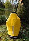 Das erste Produkt ist der Rucksack „Safepack 20l“ in gelb. Es gibt ihn auch in schwarz. Für den Outdoor-Bereich ist gelb aber die optisch schönere und frischere Wahl, egal für welche Jahreszeit. Es passt jede Menge hinein, 20l. Das Material ist absolut wasserabweisend. Die 0,5 mm dicke PVC Plane ist sehr robust. Es fühlt sich gut an, nicht zu steif und auch nicht labberig. Der Bodenbereich ist schwarz, ergänzt durch einen silbrigen Reflektor für die Sicherheit. Das Gewicht von ca. 500 g und die Maße von 240 x 240 x 600 mm passen auf jeden erwachsenen Rücken. Die Trageriemen kann man abnehmen. Der gesamte Rucksack lässt sich problemlos reinigen. Besonders pfiffig ist die Verschlusstechnik am oberen Ende. Es gibt dort keinen Reißverschluss! Man hat dort zwei parallele Metall-Bänder eingenäht, die von einem Klick-Verschluss im Halbbogen nach hinten so eng gespannt werden, dass sie dich gepresst sind und gefühlt sicherer als ein Reißverschluss den Rucksack verschließen. Selbst ein größerer Regen hat da keine Chance. Die Idee ist ausgezeichnet. Als Extra gibt es es ein wasserdichtes Reißverschlussfach.